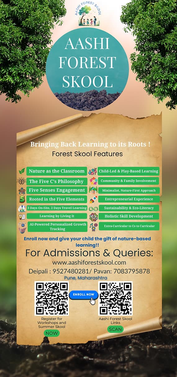 If you’re a parent looking for a school that lets your child learn through nature, curiosity, and play rather than textbooks, Aashi Forest Skool might catch your attention. This is not your typical classroom setup — it’s a forest-inspired, hands-on learning space right in the heart of Pimpri-Chinchwad.